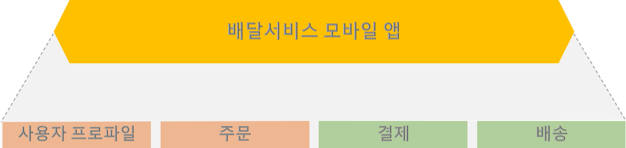 이제 이제 프로젝트 비전을 컴포넌트 단위로 나누는 방법을 알아 보도록 하죠. 프로젝트 비전은 하나의 문장이자 개념이기 때문에 실제 제품을 개발하기 위해서는 이를 테마별로 나누어 접근해야 합니다. 위에 예로 들었던 프로젝트 비전은 간단히 '편리한 배달서비스 앱'이었습니다. 이는 다시 아래와 같은 몇 개의 테마로 나누어 볼 수 있습니다.