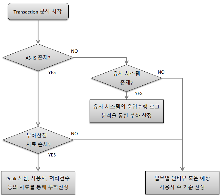 Transaction 분석 시 AS-IS의 존재, 부하산정 분석자료의 존재, 유사시스템 존재 유무에 따라 아래와 같이 부하 산정 방식이 구분됩니다.